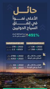 نسبة نمو إنفاق السياح الدوليين في #حائل ترتفع بنسبة 491٪! 🌍✈️ #حائل #السياحة #إنفاق_السياح #نمو_اقتصادي